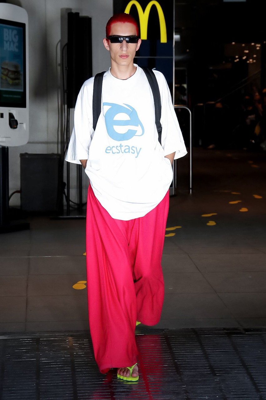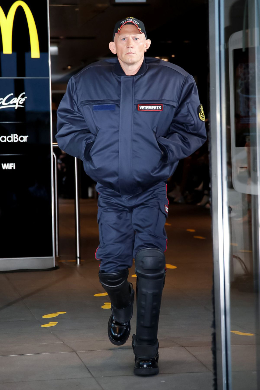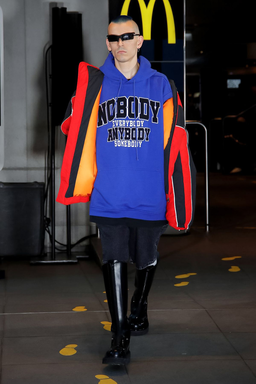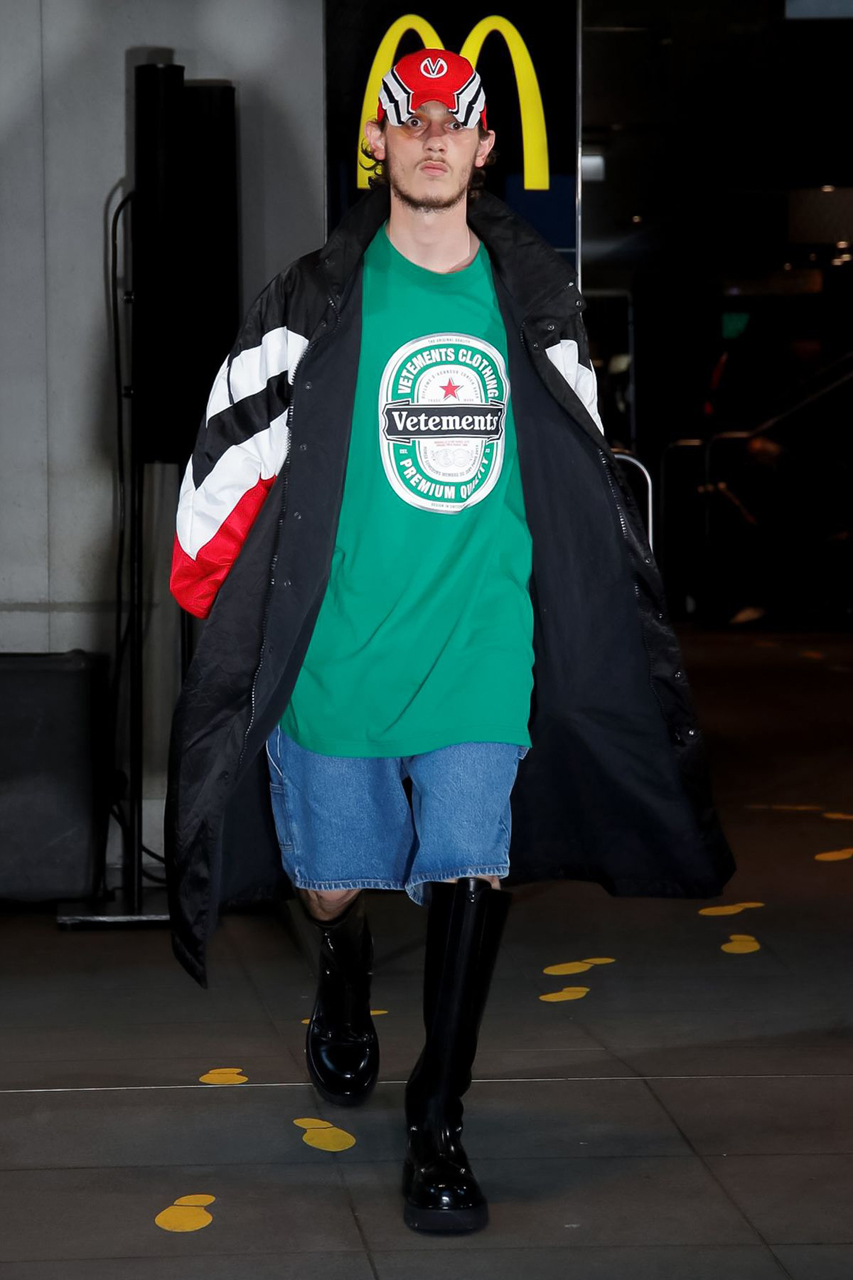 En décidant de défiler dans un McDonald, le créateur Demna Gvasalia s’est une nouvelle fois servi de la mode afin de jouer avec les codes de la pop culture : Playstation, Heineken, Manchester United, et d’autres mentions bien populaires s’imposent sur certains looks de la collection SS20 de Vetements. Des looks parés de bombers oversize, de manches extra-longues, de double chemises, de combinaisons particulières et d’autres items à la signature Vetements bien définie.