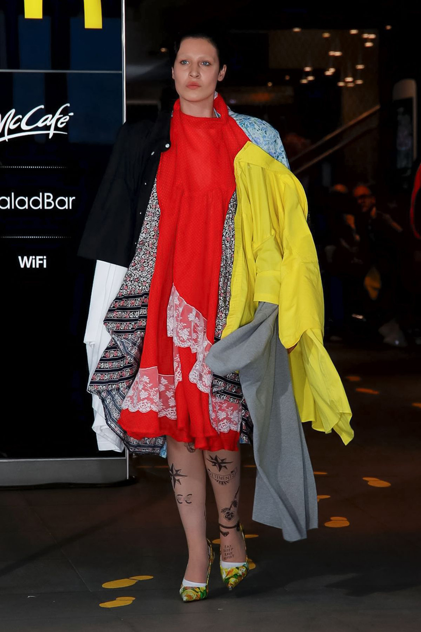 Une défilé subversif qui présente des pièces parées d’inscriptions telles que « PLAYSTATION », « CAPITALISM », « ECSTASY » ou encore « NOBODY EVERYBODY ANYBODY SOMEBODY » qui dévoilent une certaine facette militante à la collection, le designer ayant souhaité évoquer les dérives de notre société de consommation, aujourd’hui omniprésente, et cela au coeur d’un McDonald.