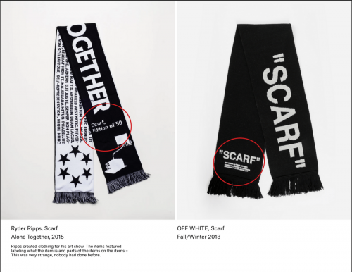 De nombreuses ressemblances ont été constatées entre les produits de Ryder Ripps et ceux d’Off-White pour lequel travaille Abloh notamment l’idée d’inscrire le nom de l’article sur l’accessoire en question « SCARF » sur une écharpe. Cette idée provient bel et bien de Ripps. Mais ce nouveau concept est rapidement devenu l’ADN de la marque et a valu à Virgil Abloh de nombreux mérites de la part de la quasi-totalité du monde de la mode.