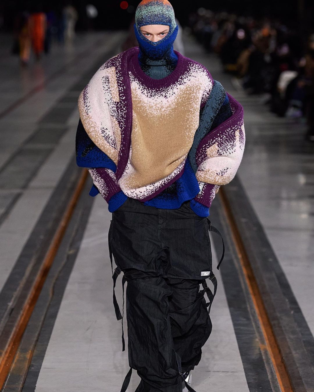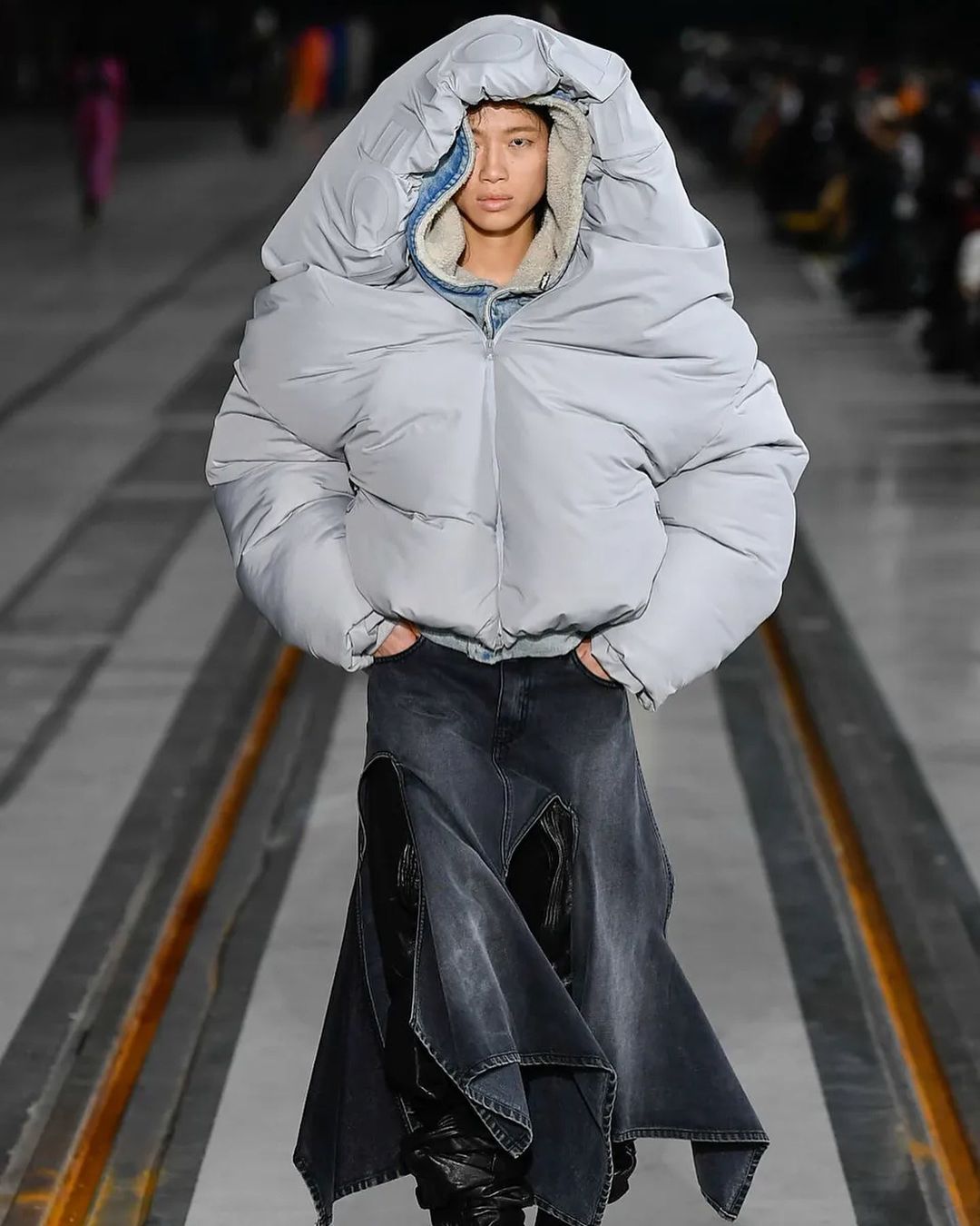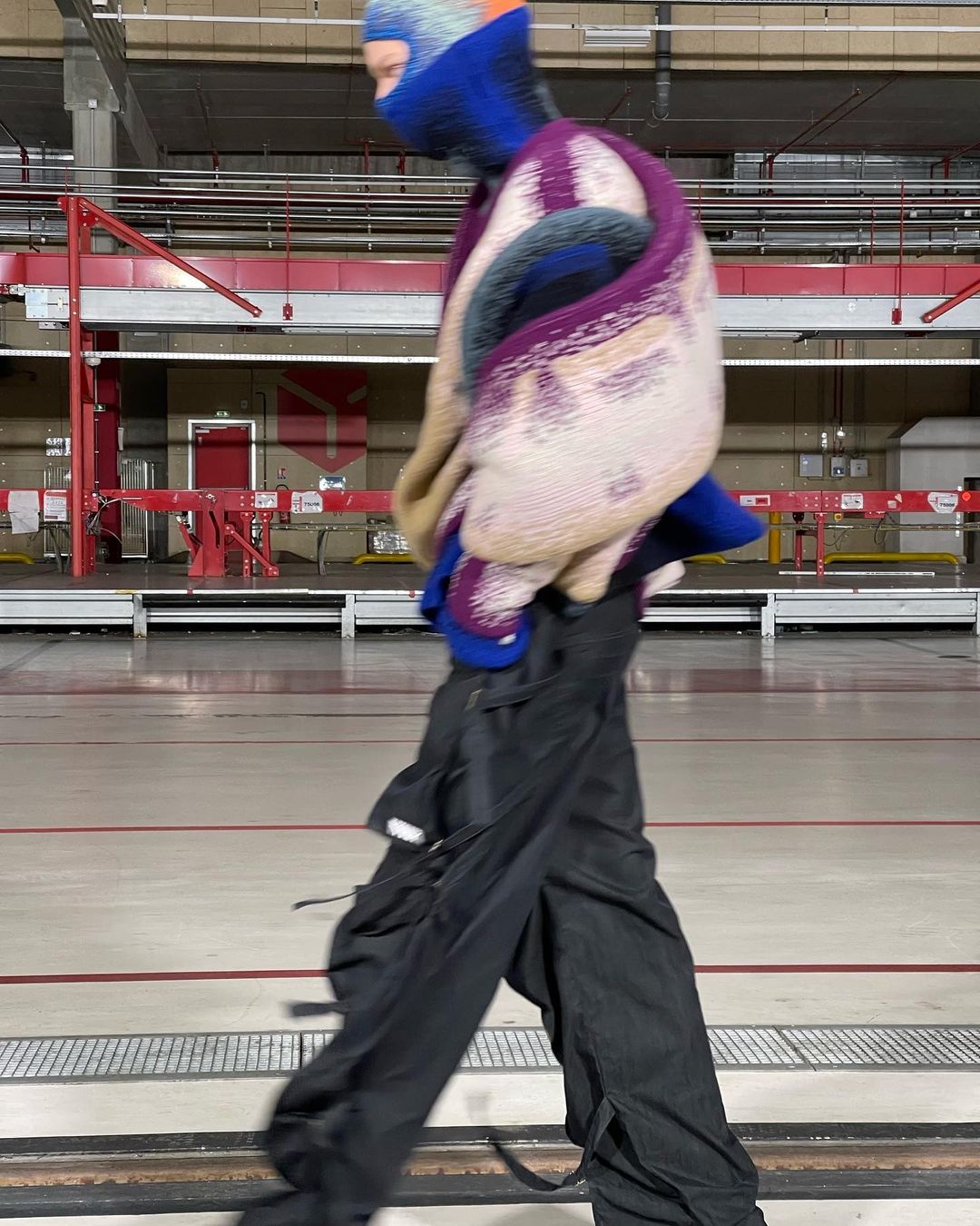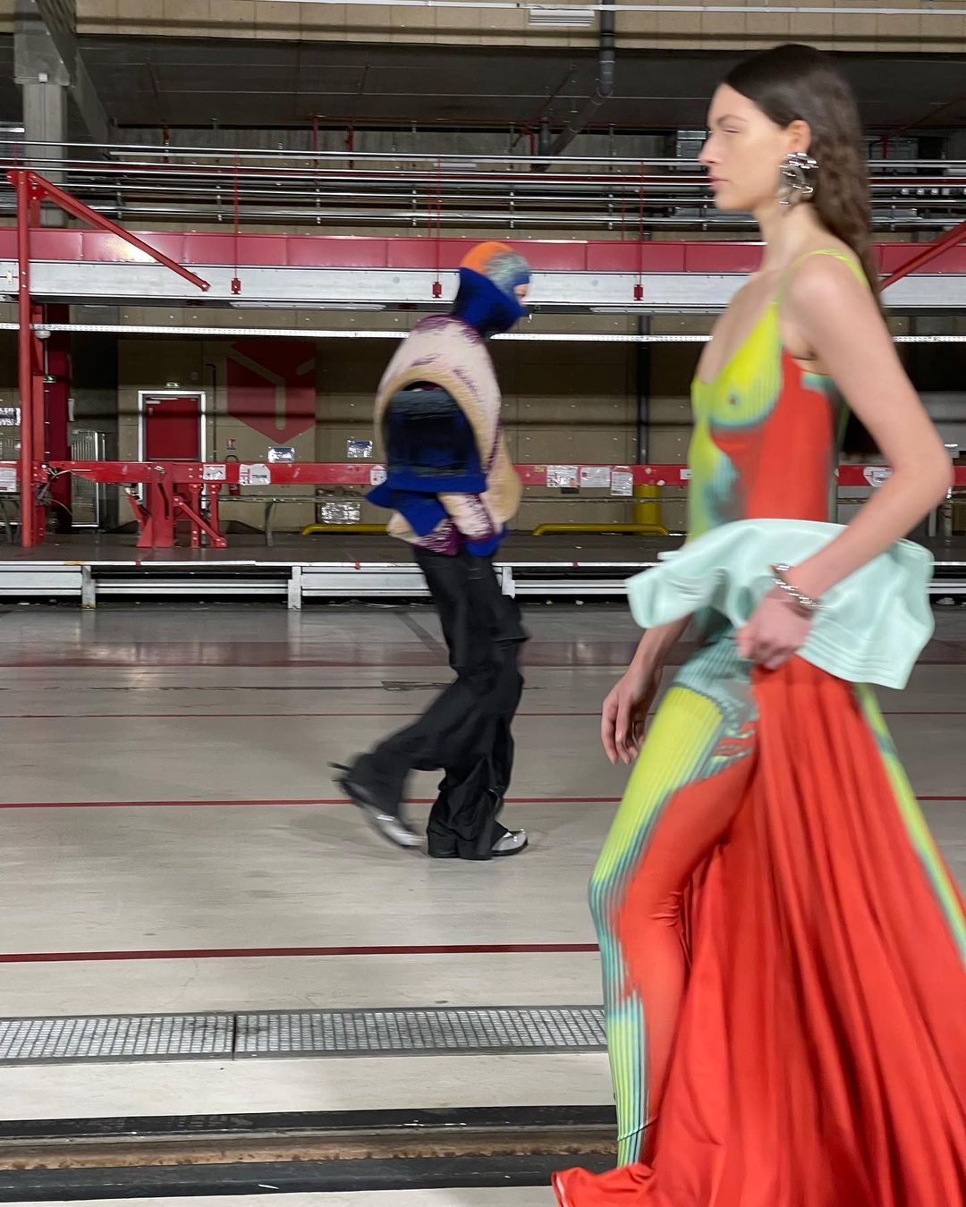 Le show, mis en scène dans un immense entrepôt, illustrait chaque mouvement et décuplait le moindre effet. À ce titre, l’environnement quasi vide reflétait idéalement bien les looks à l’allure “surchargée”. L’accent est mis sur des imprimés superposés et des pièces surdimensionnées.