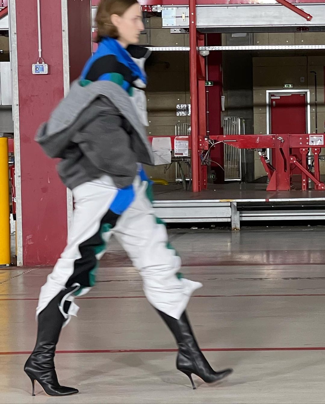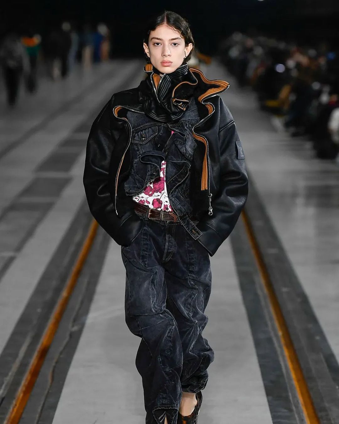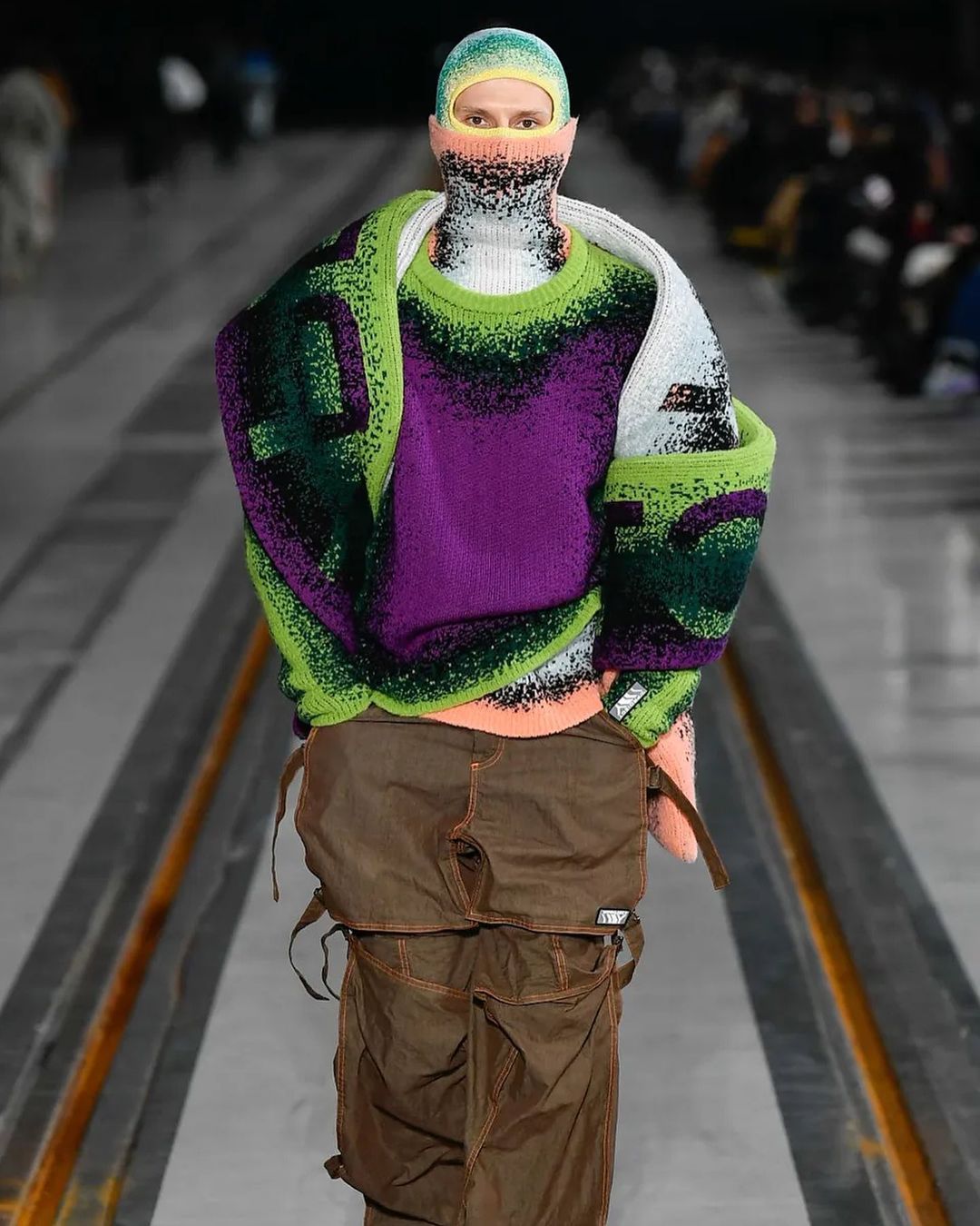 Le show, mis en scène dans un immense entrepôt, illustrait chaque mouvement et décuplait le moindre effet. À ce titre, l’environnement quasi vide reflétait idéalement bien les looks à l’allure “surchargée”. L’accent est mis sur des imprimés superposés et des pièces surdimensionnées.