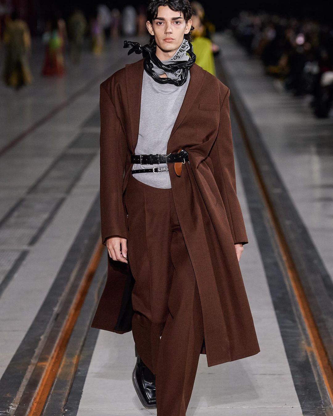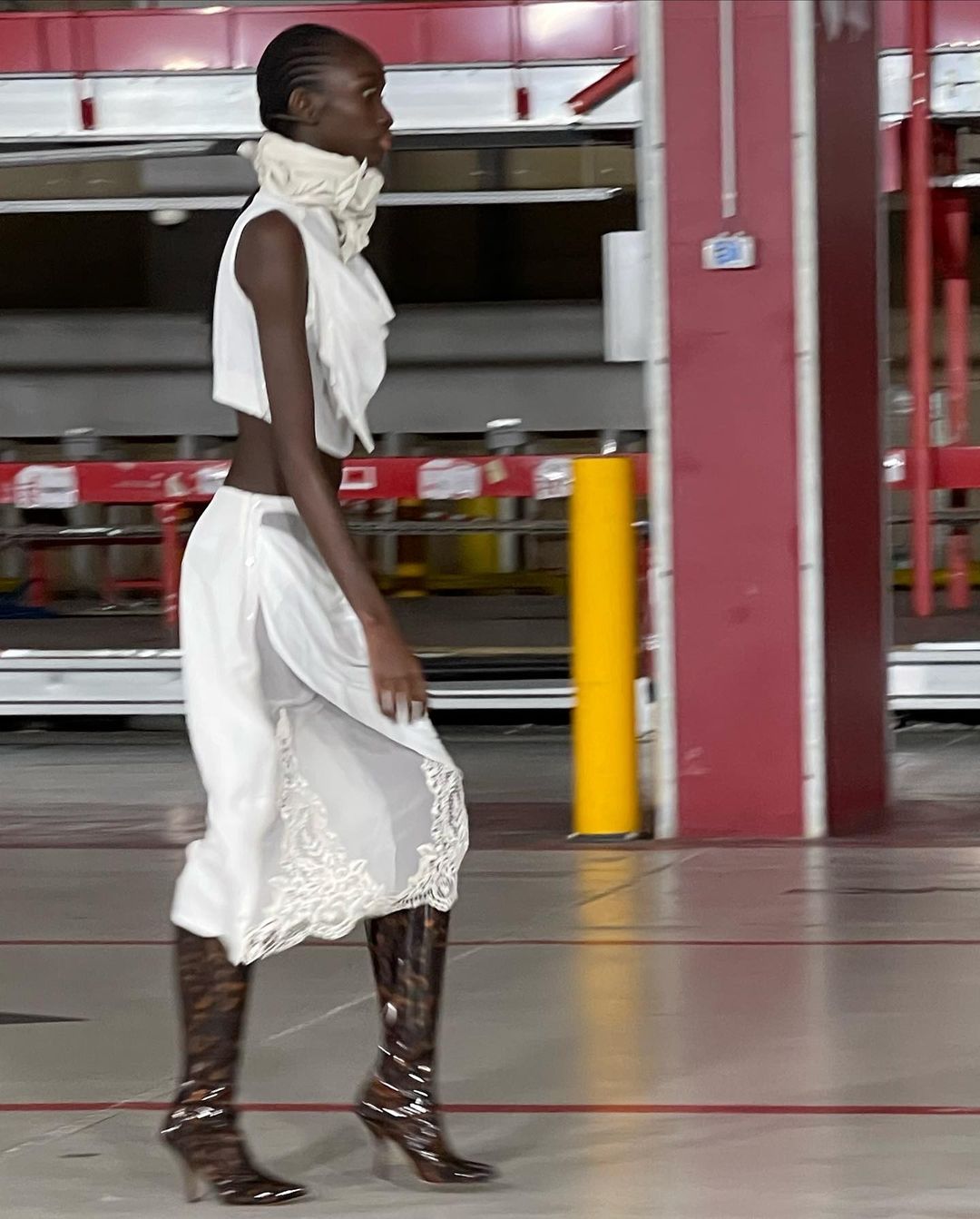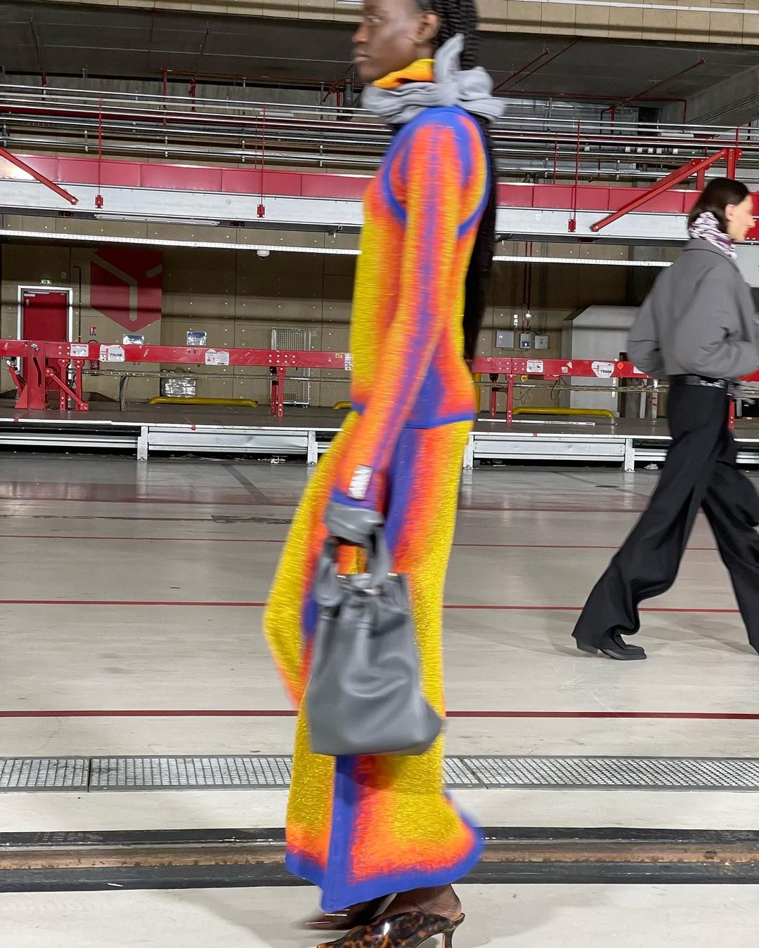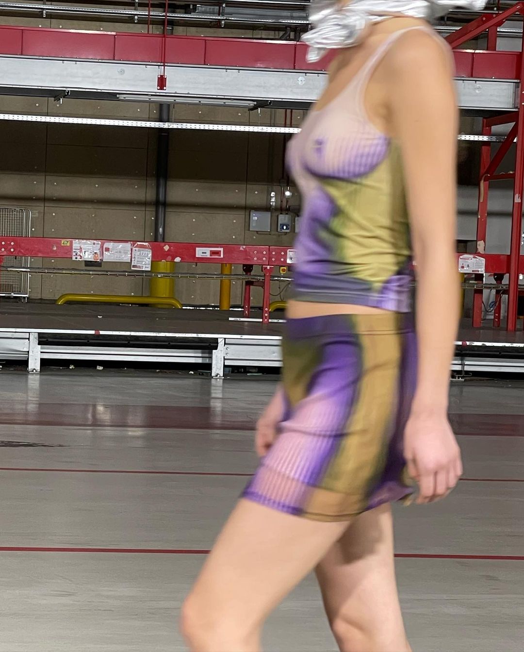 Le show, mis en scène dans un immense entrepôt, illustrait chaque mouvement et décuplait le moindre effet. À ce titre, l’environnement quasi vide reflétait idéalement bien les looks à l’allure “surchargée”. L’accent est mis sur des imprimés superposés et des pièces surdimensionnées.